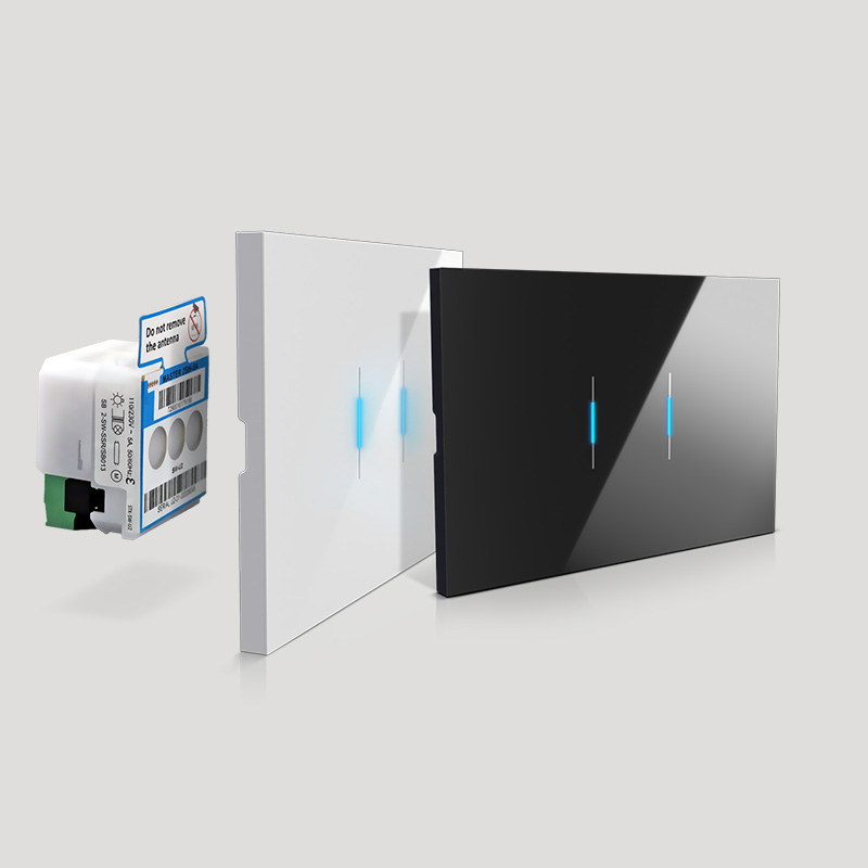 Switch GE2-XX-U2-SL is module SW-U2 (Set up as a light and shutter) Built with a decorative panel PNL-GE-WH-2 (white) or PNL-GE-BK-2 (black). For installation details, tutorial videos, and many other options for the smart switch click on the link – SW-U2.